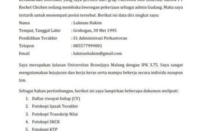 - Paragraf Pembuka: Menyebutkan posisi yang dilamar dan sumber informasi lowongan.