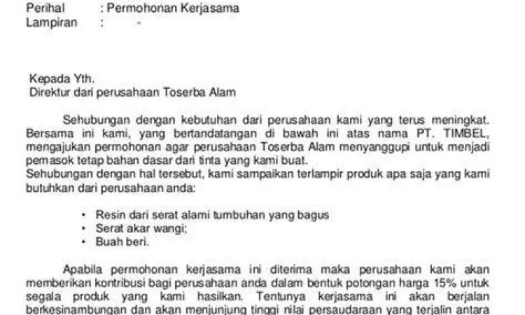 Surat ini biasanya dikirim oleh vendor atau mitra potensial yang ingin menawarkan sinergi. Poin utamanya adalah nilai tambah (value proposition) yang bisa diberikan kepada perusahaan tujuan. Fokuslah pada keuntungan bersama daripada hanya meminta bantuan.